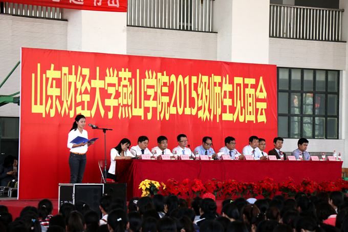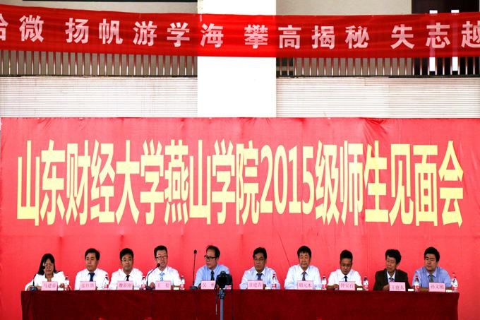 9月12日下午,山东财经大学燕山学院2015级师生见面会于明水体育馆隆重举行。山东财经大学副校长、燕山学院院长吴彬,燕山学院常务副院长甘建青,总督学胡元木,副院长魏新刚、钟安石,院党委副书记张红旗,学院各系主任与职能部门负责人出席本次见面会,2015级全体新生参加本次见面会。见面会由院党委书记王松主持。