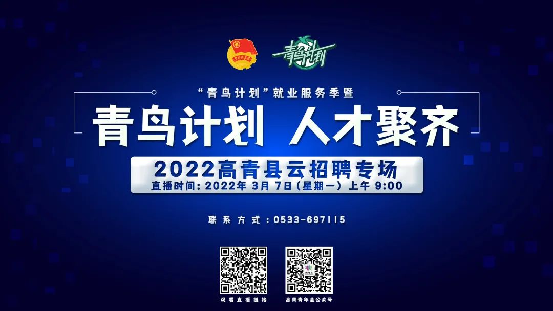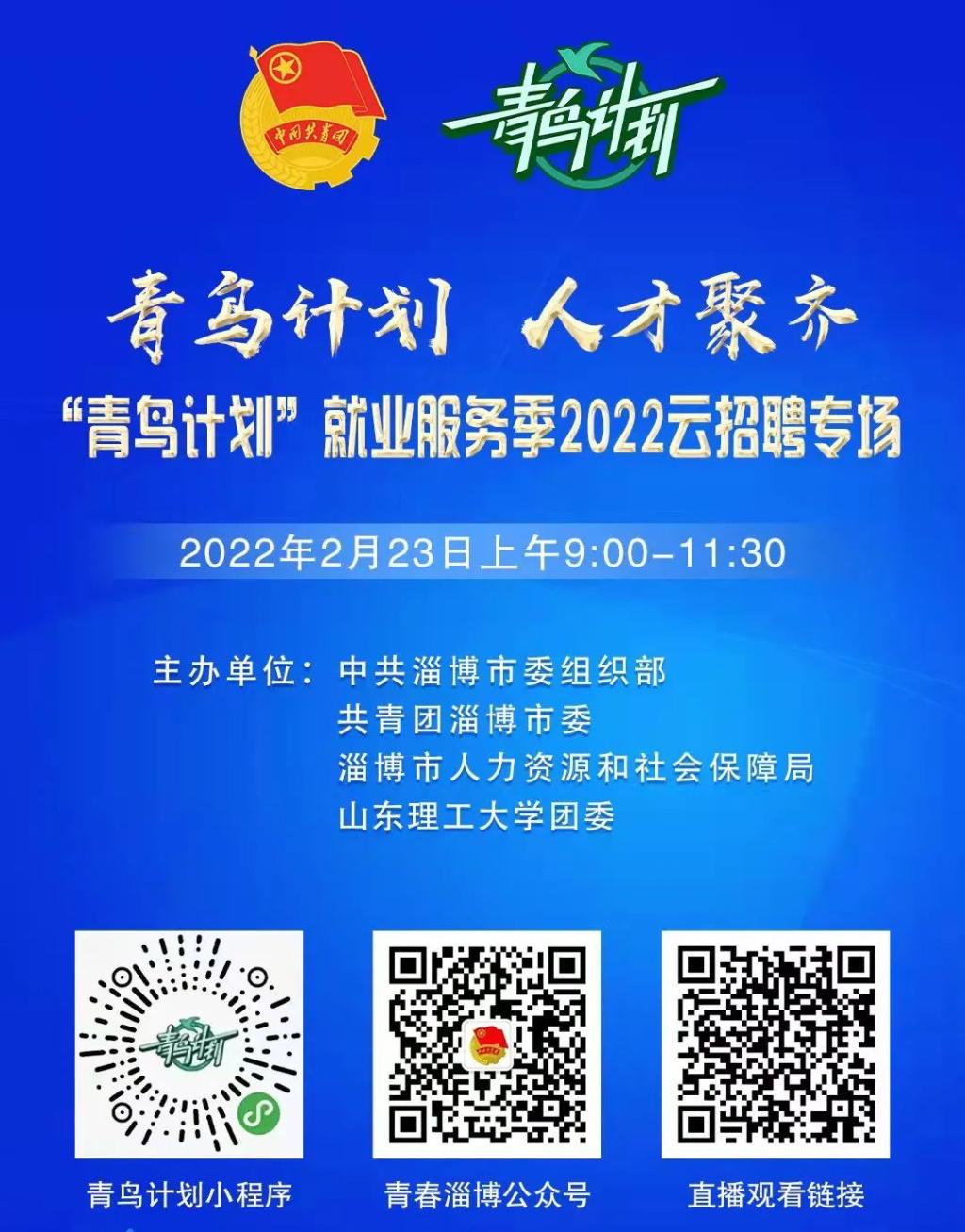 “青鸟计划”就业服务季暨“青鸟计划 人才聚齐”2022云招聘活动将进一步拓宽“云就业”渠道,吸引更多青年学子来淄就业,为淄博企业招揽人才,为全市招才引智工作大局做出更大贡献。