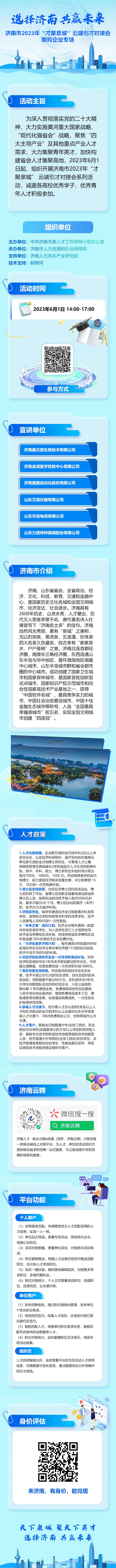 为深入贯彻落实党的二十大精神,大力实施黄河重大国家战略、“现代化强省会”战略,聚焦“四大主导产业”及其他重点产业人才需求,大力集聚青年英才,加快构建省会人才集聚高地,2023年6月1日起,特举办济南市2023年“才聚泉城” 云端引才对接会系列活动,诚邀各高校优秀学子、优秀青年人才积极参加。